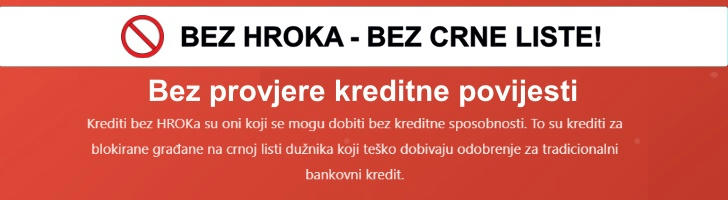 Bez provjere kreditne povijesti | Samo osobna iskaznica | Do 4.000 €:Krediti bez HROKa su oni koji se mogu dobiti bez kreditne sposobnosti. To su krediti za blokirane građane na crnoj listi dužnika koji teško dobivaju odobrenje za tradicionalni bankovni kredit.